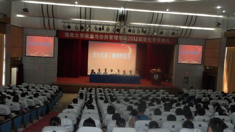 2012年9月4日上午8点,william威廉英国官网政治与公共管理学院在原行政办公楼二楼报告厅隆重举行2012级新生开学典礼,院长安应民,党委书记王默忠,党委副书记段捷频,副院长江红义,行政办主任陈秀彬,各系主任,及广大教职工出席;2012级的290多名新生和部分家长、老生代表一同参加。大会由院党委副书记段捷频主持。