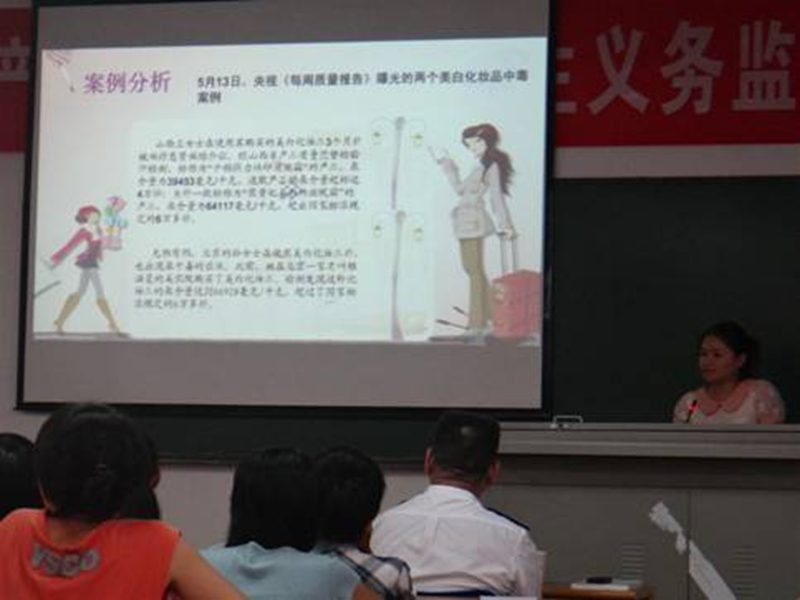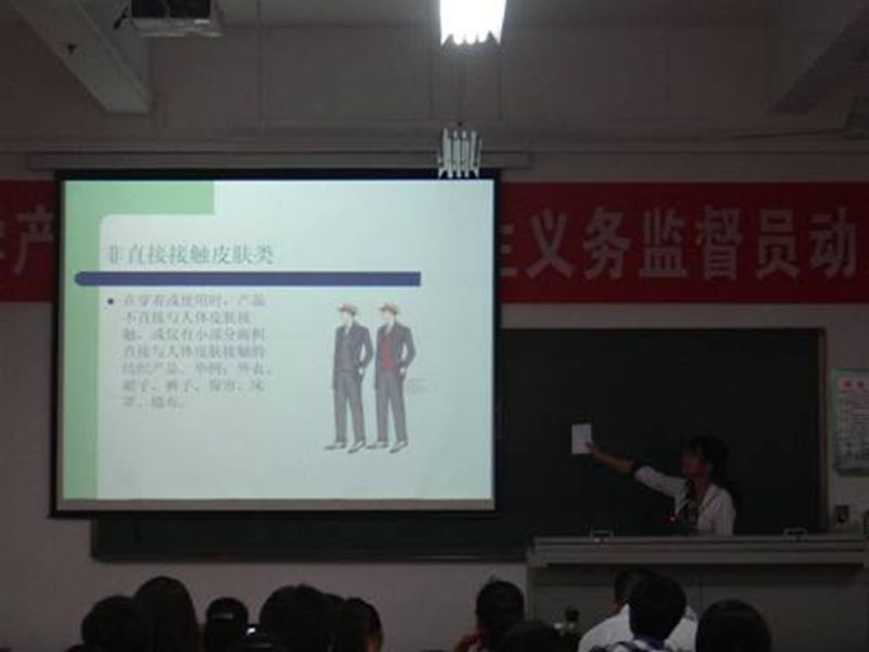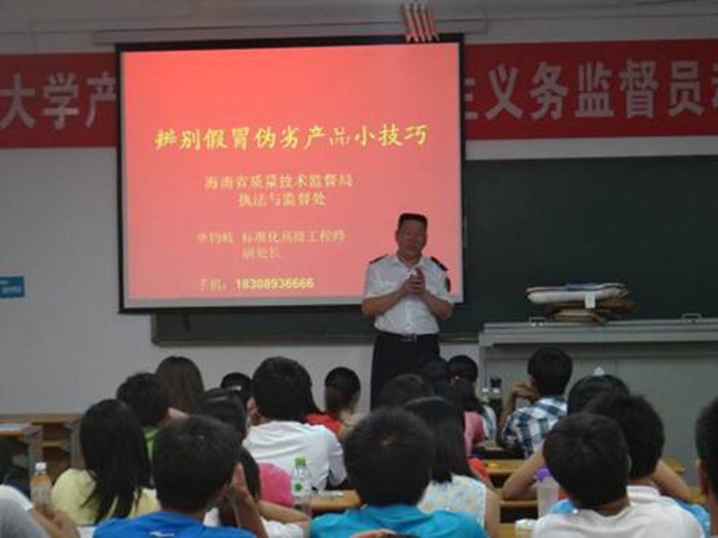 大会第一项,王明勤处长发表重要讲话。王处长指出质量监督的重要性,并告诉我们,当代大学生要积极投身质量监督,为建设质量强国贡献我们的青春和力量。然后,三位专家分别从贴近生活的产品入手,对有关食品、化妆品和纺织品的质量安全知识进行了介绍。专家告诉我们,如何用一些简单又实际的方法辨别食品、化妆品以及纺织品的真伪,使我们受益匪浅。最后,单钧歧副处长结合实际,用激情饱满的语言向我们介绍了几种辨别电线的真伪和质量的简单方法,如:用火烧一下电线通过看电线的反应现象等。他用“质量发展是兴国之道、强国之策”,以“质量兴衰,匹夫有责”两句话告诫我们,质量安全对我们的重要性。