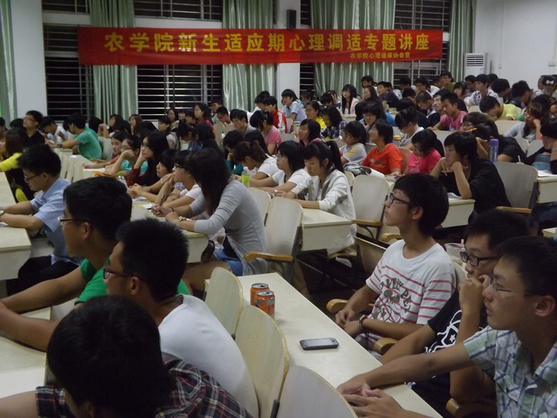 2012年11月13日、14日晚7:30,农学院分别在2-201教室和3-210教室开展了主题为“适应中成长”的大学新生适应期心理调适讲座。学院心理辅导员、国家二级心理咨询师李洋老师担任主讲。2012级527名新生分两批聆听了讲座。