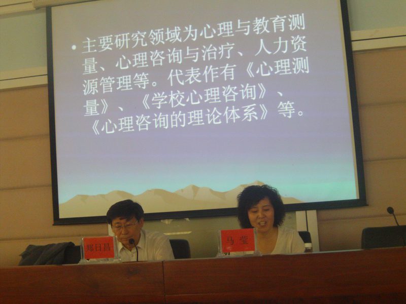 讲座开始前,马莹教授隆重介绍了郑日昌教授的个人简介,并对他做客我校表示热烈的欢迎和由衷的感谢。郑日昌教授现任北京师范大学教授、博士生导师,中国浦东干部学院访问教师(中组部派遣),中国社会心理学会常务理事、中国心理学会临床心理与心理咨询专业委员会副主任、中国性学会常务理事、教育部考试中心兼职研究员、教育部中小学心理健康教育专家指导委员会委员、教育部普通高等学校学生心理健康教育专家指导委员会委员、人事部人才测评师认证专家委员会主任,卫生部心理治疗师考试专家委员会委员、全国标准化技术委员会委员。