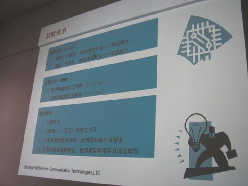 2010年3月9日下午3点30分,北京万思维通信技术公司的李总在我院117房与2006届毕业生做面对面的交流。 该公司于2007年在北京注册,专注TD网络规划与优化服务,受学院学工办伍主任的邀请前来我院招聘3—6名通信、计算机类的应届毕业生,据悉,场面讨论氛围热烈,同学们的积极性很高,供需双方相对比较满意,此次的招聘取得圆满的成功。