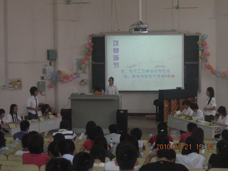 正方观点“当今社会就业应干一行,爱一行”,反方观点“当今社会就业应爱一行,干一行”。辩论赛分为开篇立论、攻辩环节、攻辩小结、自由辩论和总结陈词五个环节。辩论赛以歌曲《你是我的眼》拉开序幕,主席说明了辩论赛评分规则、标准及注意事项。在开篇立论环节,双方一辩各自阐述了本方主要观点,之后展开了精彩的辩论。最激烈的是自由辩论环节,双方辩友唇枪舌战,论点鲜明,论据充分,论证合理,现场气氛达到最高点。总结陈词中双方进一步申明了所持观点,并互相指出了逻辑疏漏、论证不足之处。苏文魁老师对比赛做出点评,他指出辩手们应该注重在哲学的深度上加以辩论,加深辩题深度。比赛结果是反方获胜,反方二辩周凤婷同学获“最佳辩手”。孙晓媛副书记为获奖者颁奖。最后,一首动感的英文歌为本次辩论赛增添了不少光彩,比赛划上圆满的句号。