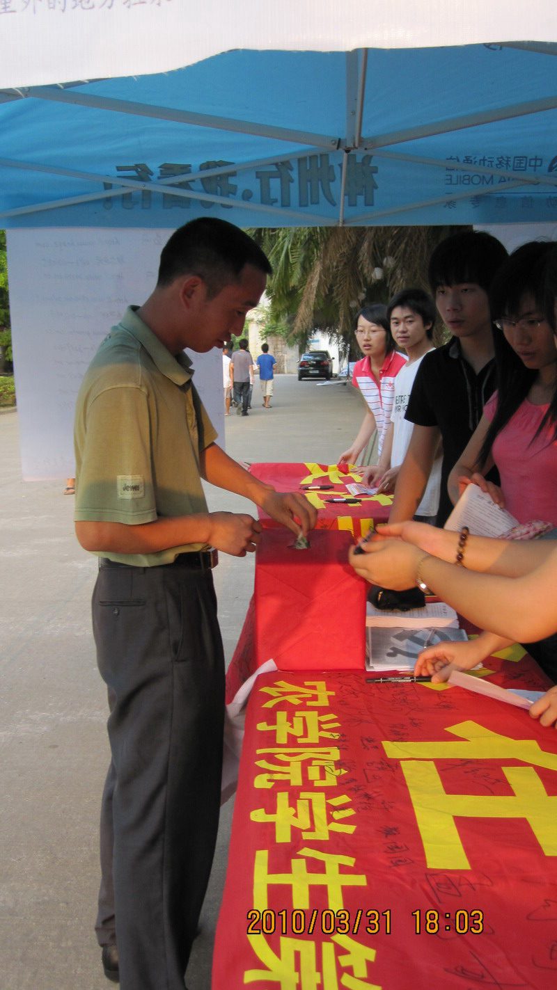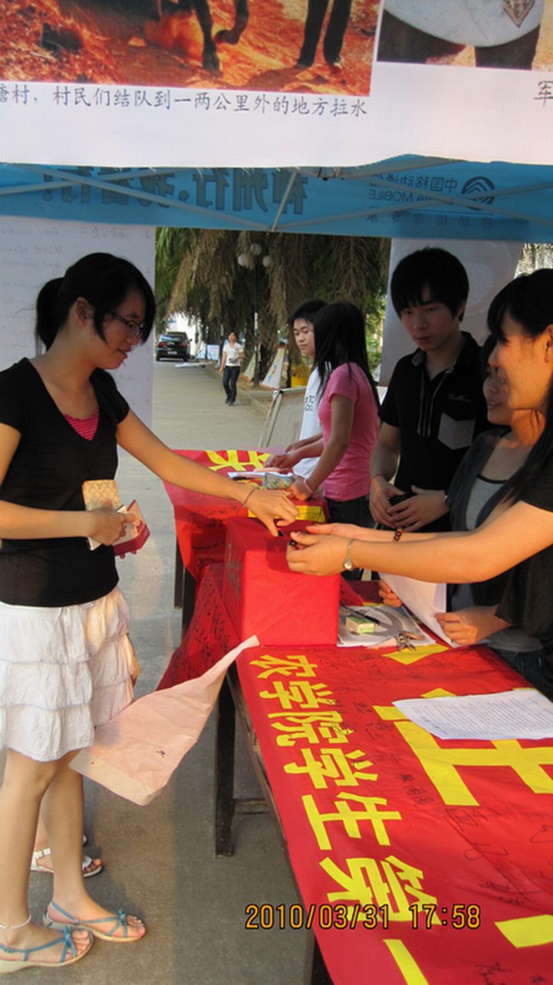 本次活动引起了同学们的广泛关注,大家积极参与,现场气氛热烈。很多同学纷纷走向捐款箱,献出自己的爱心。06级生物技术的洪君宝同学在活动一开始就来到捐款现场,并捐出了200元钱,他表示,虽然自己也在创业,急需资金,但是西南旱区小朋友那干裂的嘴唇,揪着他的心。本次爱心募捐活动共筹集善款4434元,已全部捐给海南省红十字会,专用于本次西南地区抗旱。