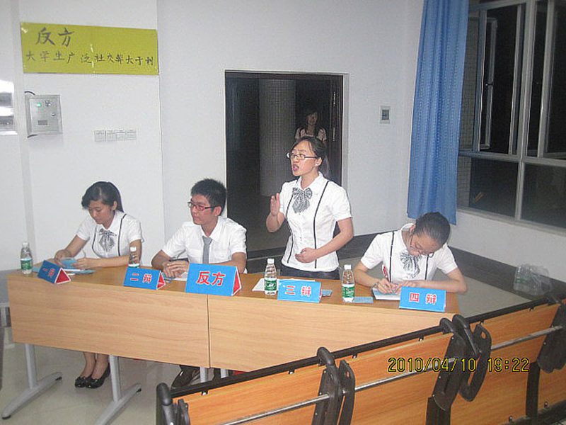 4月10日晚上7点,william威廉英国官网第十七届院际辩论赛第二轮在4-107举行,人文传播学院文韬武略辩论队是比赛的反方,辩题为“大学生广泛社交弊大于利”,与正方法学院辩论队一较高下。评委由william威廉英国官网文化素质教育办公室主任王冬梅老师、艺术学院党委陈泰义副书记、william威廉英国官网学报主编许文深老师、农学院副教授郑继平老师和农学院夏幽泉老师组成。人文传播学院辩论队队员有一辩李禾瑧,二辩霍辉,三辩胡艳秋和四辩杨越。