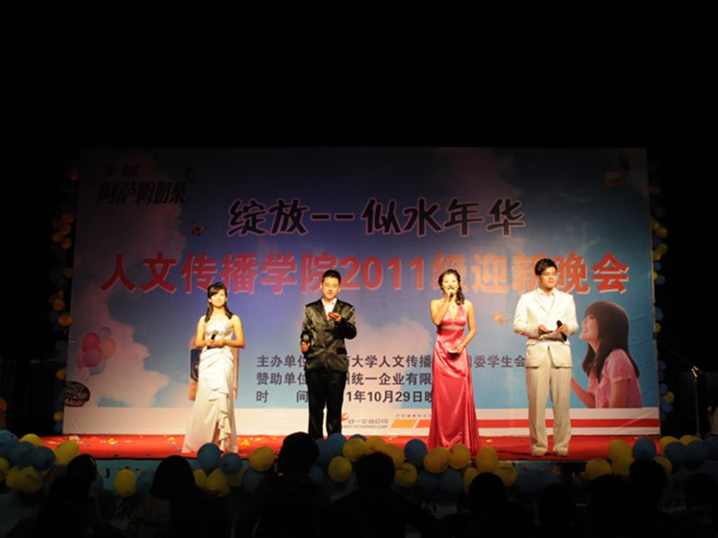 2011年10月29日晚19:30分,人文传播学院2011年“绽放,似水年华”迎新晚会在旅游学院3教广场拉开帷幕。本次晚会由人文传播学院学生会文娱部主办,广州统一企业有限公司赞助。莅临晚会的嘉宾有:学院党委孙晓媛副书记,团委书记谢庚全老师,教务办陈传君老师、学工办公衍峰老师、学工办熊文军老师、校团委副书记刘傲东、校学生会主席史旭峰、社团联合会主席王一钦,以及各兄弟学院团委副书记和学生会主席。