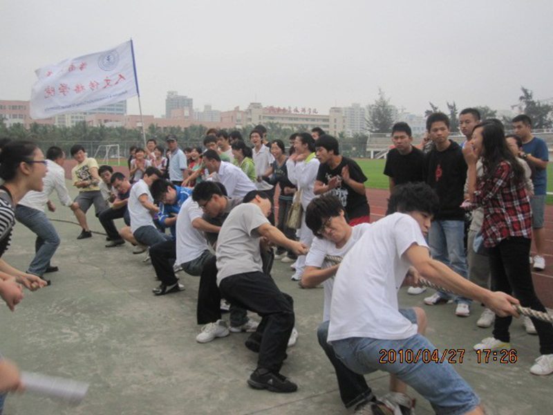 拔河比赛首先开始,我院首场对阵理科诸强之一的材料化工学院,选手们团结一致,在我院同学的助威声中,轻松地连胜2局,顺利晋级。与土木建筑工程学院的比赛中,我院选手继续上一轮中的劲头,以2:0获胜,进入4强。小组赛最后一场,我院遭遇卫冕冠军、实力超群的经济与管理学院,最终屈居小组第二,进入半决赛。我院半决赛中对阵另一组第一的政治与公共管理学院。政管学院率先发力,绳子逐渐朝他们一方移动。但在苏老师、公老师、王远露学长的带领下,我院啦啦队大声呐喊助威,选手们一点一点地挽回颓势,先下一城。易地再战,我院再一次反败为胜,以2:0的比分淘汰了政管学院。我院进军决赛,并最终获得了全校第二名的好成绩。