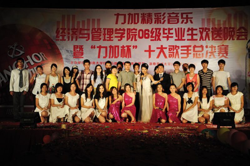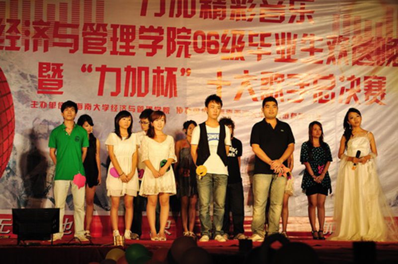 5月23日晚,经管学院06级毕业生欢送晚会暨“力加杯”十大歌手总决赛在起点草坪盛大开幕。经管学院党委符史岱书记、冯广波副书记、学工办吴新、杨智平、俞花美、杨扬、王昌纯老师和全院学生观看了晚会。 院党委冯广波副书记为晚会致辞,冯书记带着祝福,饱含深情的祝愿大四的同学们能够有一个美好的未来,闯出属于自己的一番天地,常回母校看看。晚会正式拉开帷幕。无论是劲歌热舞,还是带着无限祝福的话剧表演、选手们的PK赛,亦或是诗歌朗诵,都让现场观众沉浸其中。看台上,灯光迷离,优美的舞姿,动人的歌声,一个个学生化为生活的天使;观台下,群起欢呼,掌声,互动,观众们变成了欢乐的精灵,演员们脱下了学生装,换上了模特服,迈着自信的步伐走了出来,演绎着各式各样的美丽。很快,通过专业评审的各轮评选,十大歌手总决赛就选出了冠亚季军。当观众们还沉浸在欢乐声中,手语节目缓缓登场,全场无声,伴着美妙的音乐,整齐的动作,用手给学长学姐们带去我们最深的祝福,把温情撒遍校园的每一个角落。晚会缓缓落下帷幕。 时光的天使从我们的身边走过,岁月的颂歌在我们心中铭刻。栀子花开,四年大学生活却即将划上句号。让我们共同祝愿海大经管大四学子漫漫人生路能够一帆风顺,用他们的双手创造出更加美好的未来。让我们期待他们在社会这个大舞台上有更加出色的表现。今夜让欢乐与激情在活动中心成为永恒的主题……