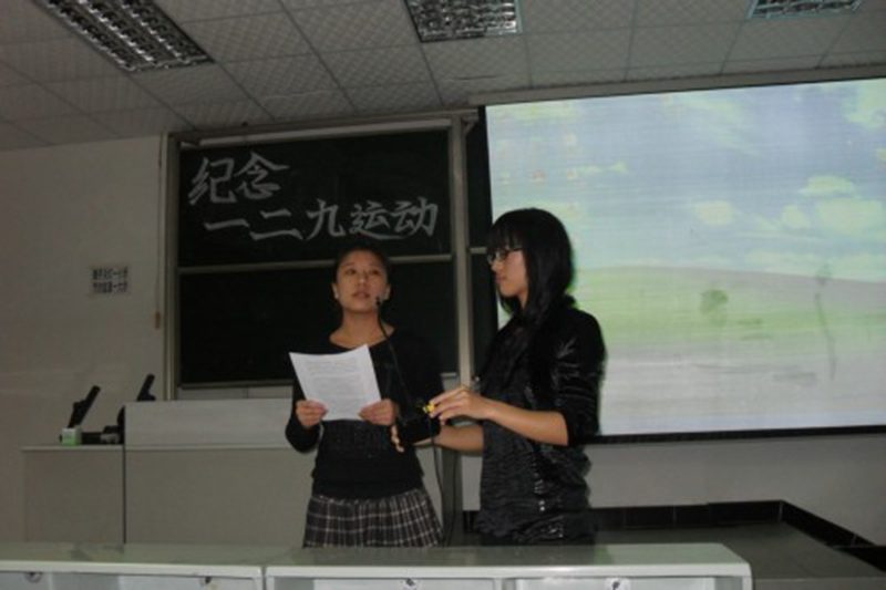 活动首先由谢娟主持讲述关于“一二•九”运动的历史,并播放相关革命歌曲和“一二•九”运动的影像资料。随后,班级的三名同学很有激情地朗诵了关于“纪念一二•九运动”的革命诗歌,极大的推动了活动现场的爱国气氛。在活动中,随着五名同学对“一二•九”运动的背景、过程和发展、历史人物等方面的详细讲解,增强了在座同学对当年中国共产党的领导的革命活动的了解,“遗忘是一种背叛,我们应该铭记历史,立足于现在好好学习,学以致用的为国家出力!”,“老一辈的革命前辈爱国精神让我们很感动和动容”,“在现在这个新的世纪,和以前的历史环境又不同,我们爱国更要理性爱国!”……同学们在活动的讨论过程中纷纷发表了对老一辈革命烈士们的崇敬之情以及对一二•九运动的深入感想。 在活动快到达尾声时,班上的入党积极分子和党员纷纷发表演讲,阐述了自己对一二•九运动的认识和爱国之情,使活动的爱国氛围达到高潮。 活动结束后,符涛老师对此次活动给予了高度评价,并对班上的同学提出了鼓励、要求和精彩的点评。同时,通过这次活动,班上同学们一致认为我们应当将爱国热情融入到日常生活中,把身边的小事做好,这正如符涛老师对同学们的期待:“……现阶段弘扬爱国主义精神,在座同学应该加强自身理论修养的同时提高自身素质,要先修身养性,同时承担社会给予责任……”。 此次纪念“一二•九运动”活动的成功举办,不仅让更多的同学了解到一二•九运动的历史意义,同时也进一步激发了我们当代大学生的爱国热情,端正了部分同学对马哲课程的学习态度,为今后的思想政治课程的学习营造了一个良好的学习氛围。