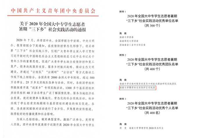 近日,团中央对2020年全国大中专学生志愿者暑期“三下乡”社会实践活动进行了通报,表彰了一批优秀单位、优秀项目及优秀个人,我院“鹦哥岭自然保护区实践团”荣获2020年全国大中专学生志愿者暑期“三下乡”社会实践活动优秀团队。