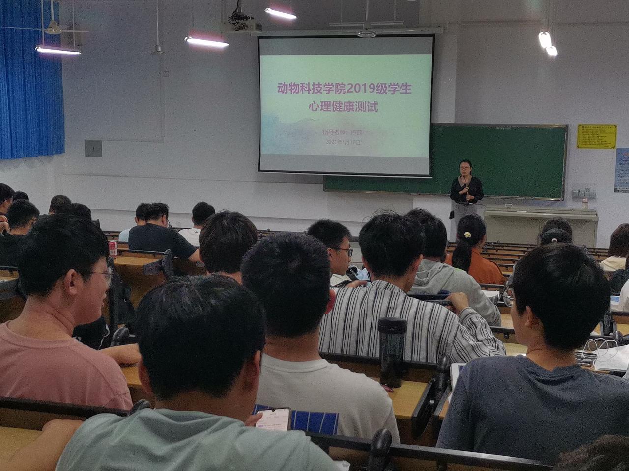 2021年3月10日下午,动物科技学院2019级全体同学在五号教学楼212教室进行了心理健康测试。测试前,心理辅导员卢茜老师向同学们讲解了心理测试工作的重要性,向同学们简单介绍了相关心理知识,带领同学们平心静气一分钟,再认真完成测试。