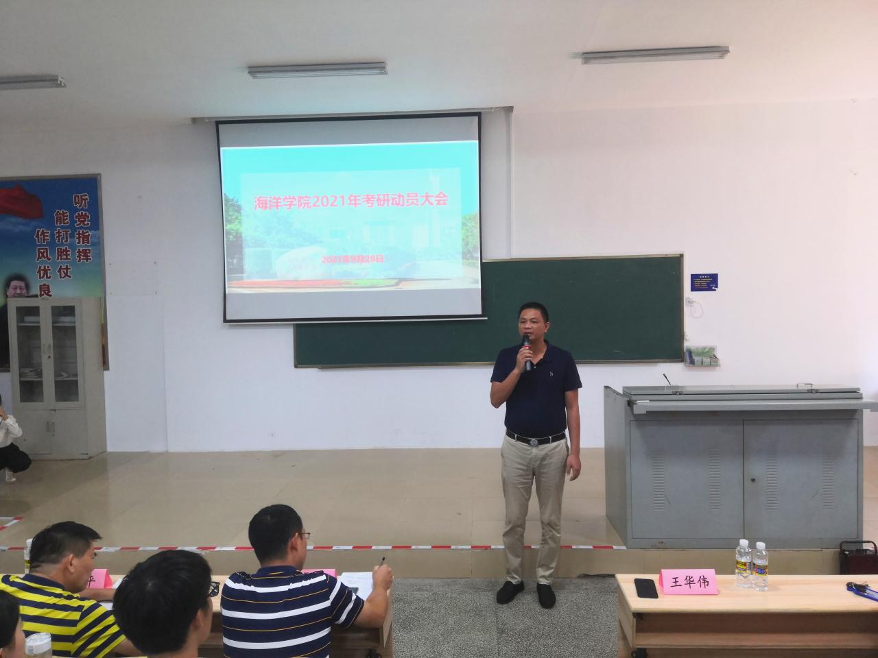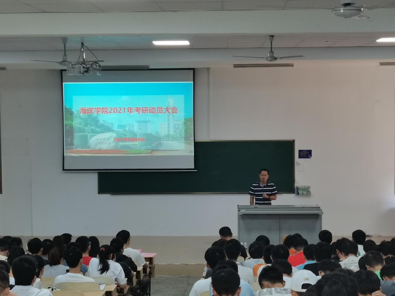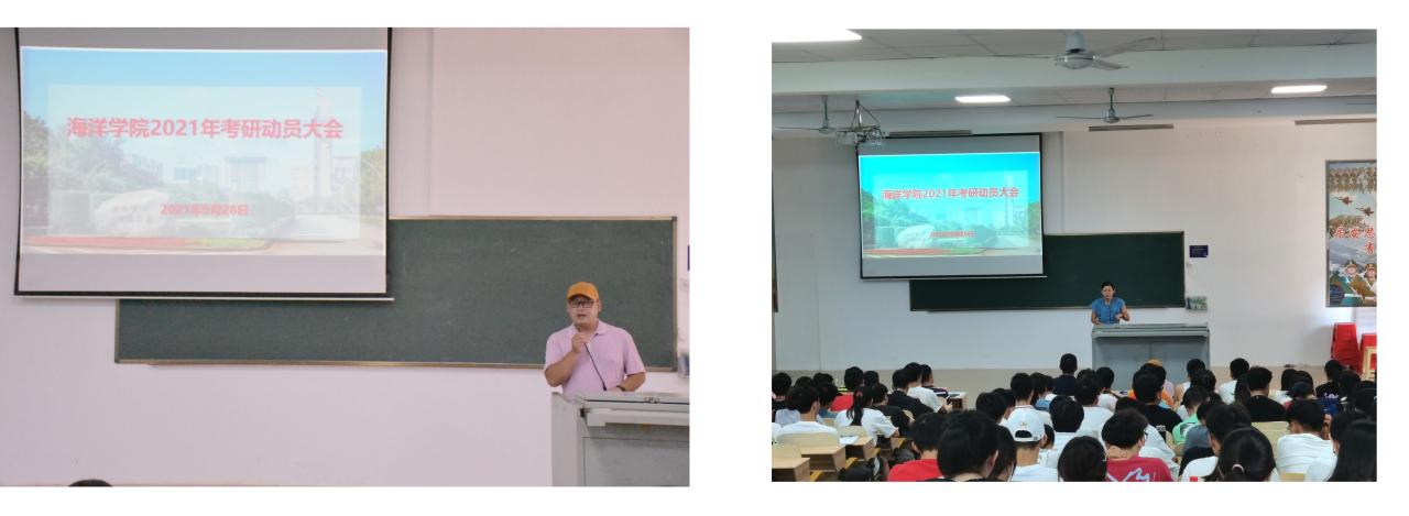 海洋学院于928日下午在1-T101教室举行2021年考研动员大会。学院党委书记陈平,副院长骆剑,党委副书记王华伟,专任教师孙云、任伟,辅导员符慧以及20182019级学生参加大会。会议由学工办主任副沈立岚主持。