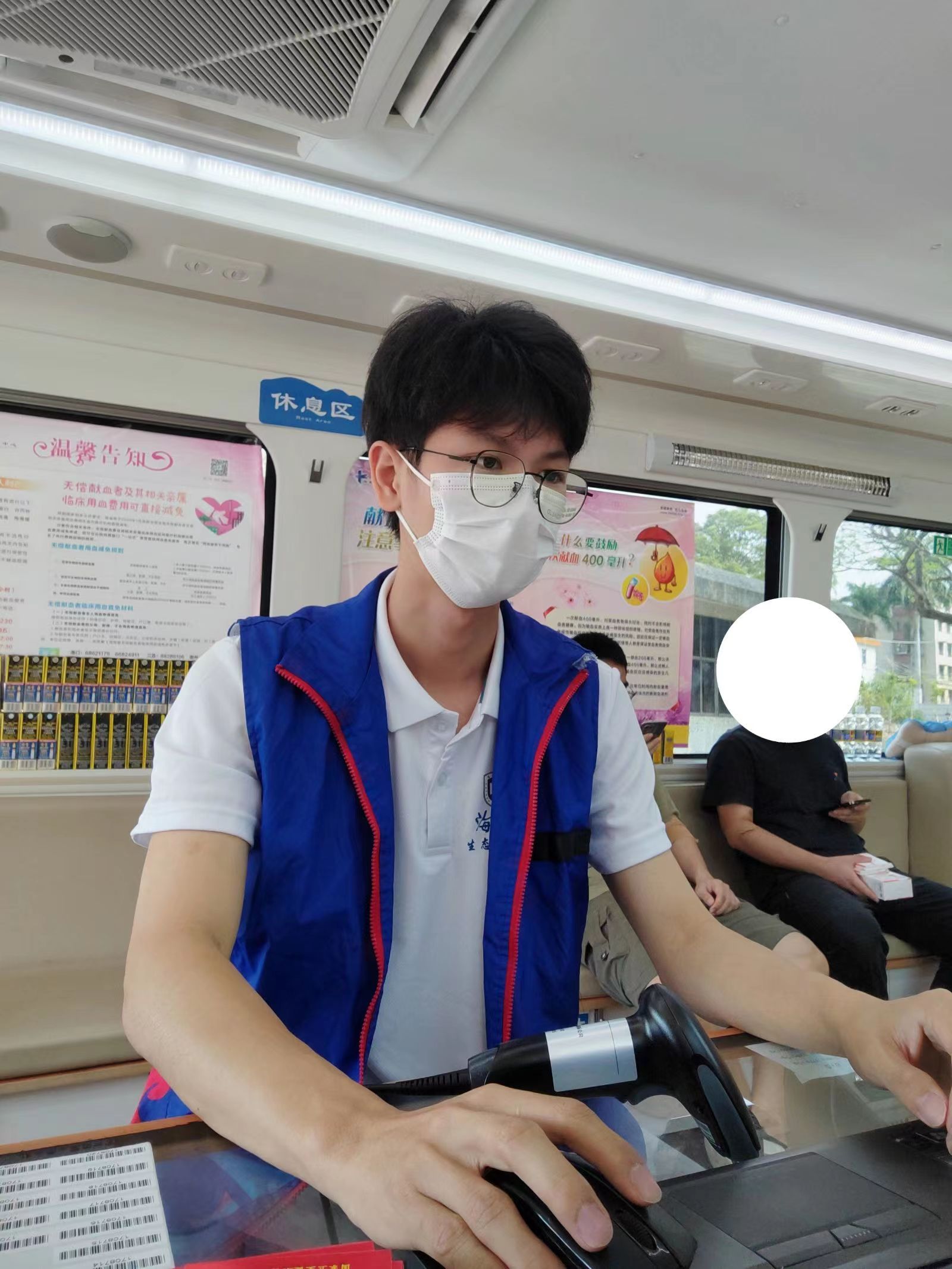献血现场,同学们们严格按献血流程进行献血登记、测量血压、采血化验,确认血液,合格后有序献血。