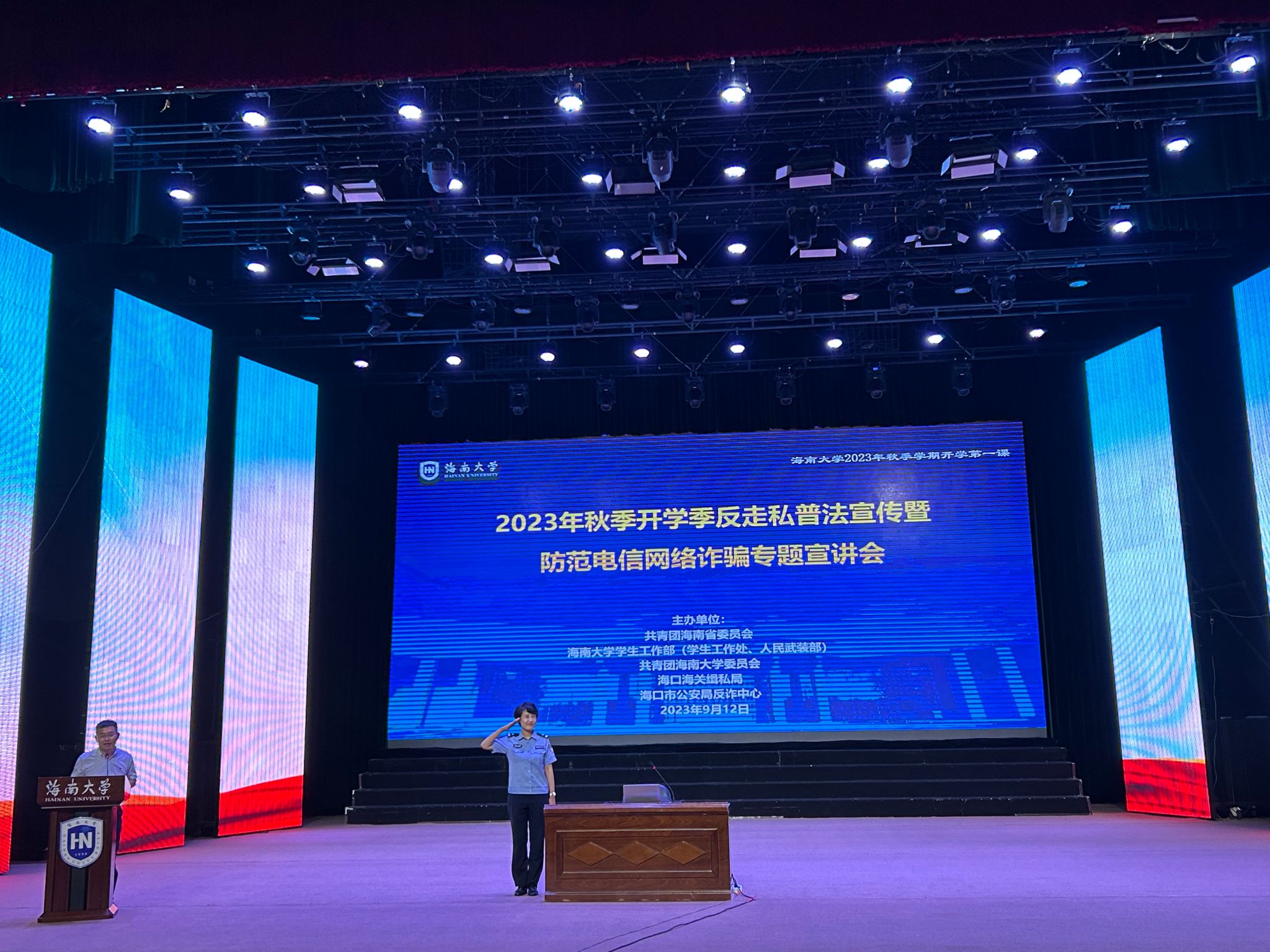 学生工作部统筹组织,邀请海口海关缉私民警在海甸校区、城西基础教学部、儋州校区、观澜湖校区、三亚崖州湾科教园等面向新老生开展多场普法宣讲。海口海关缉私民警结合法律条文和现实案例,全面细致地向同学们讲解防范离岛免税“套代购”走私违法犯罪的重要意义和相关政策规定,教育引导同学们提高防范意识,精准识别、自觉抵制“套代购”走私行为。