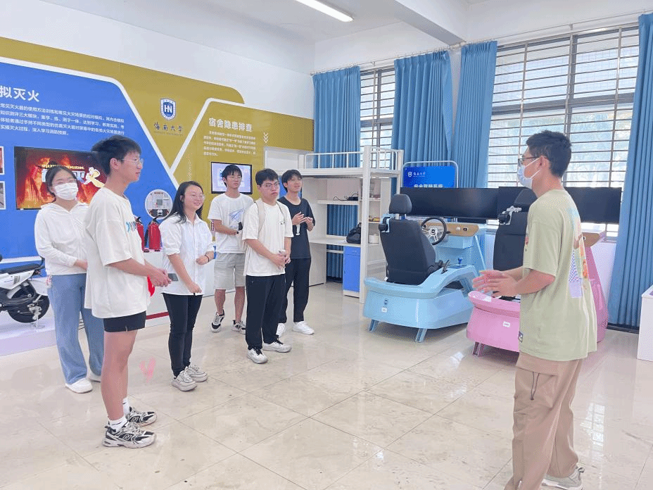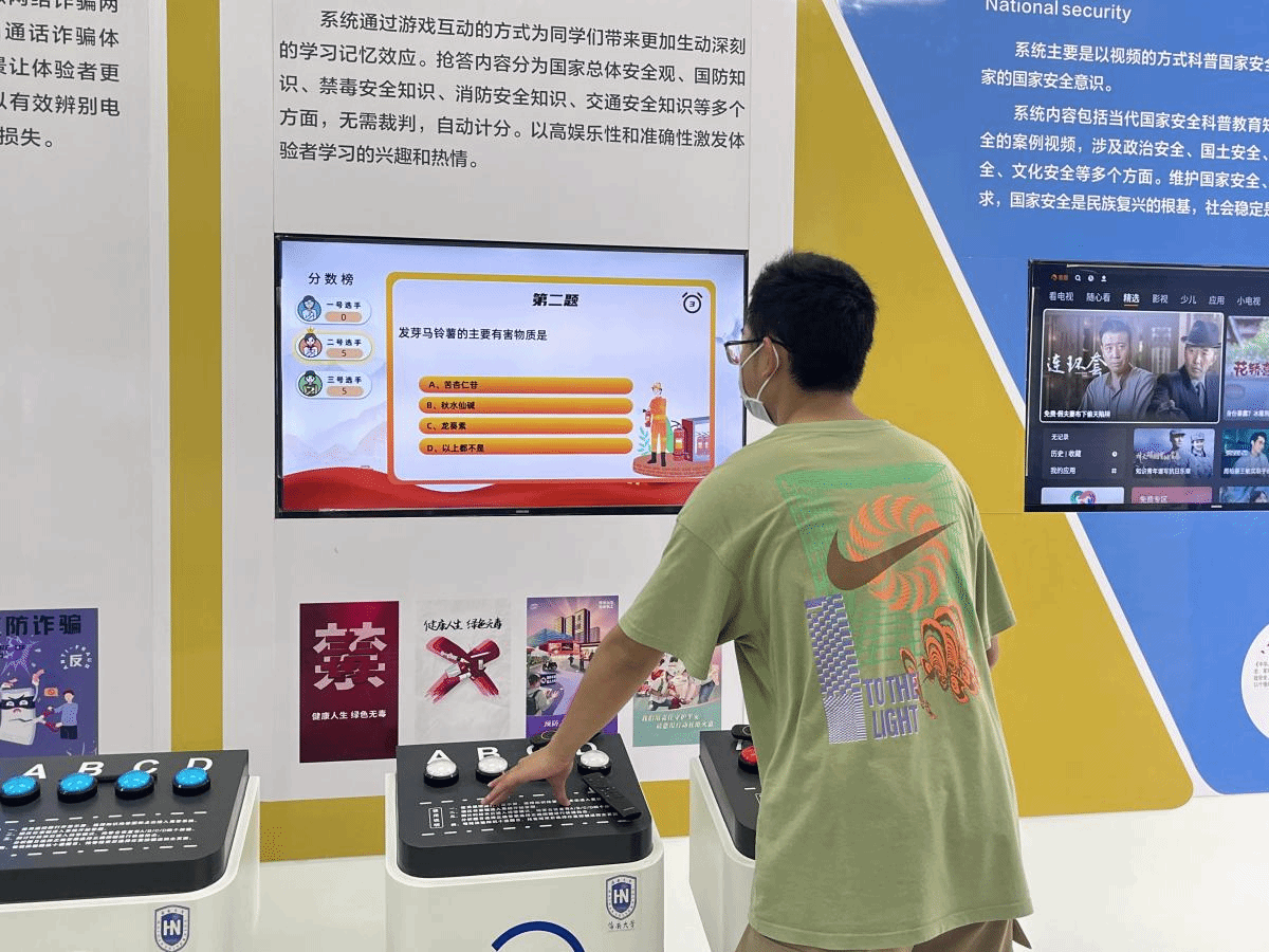 讲解员向同学详细介绍了场馆内设置的总体国家安全观学习、安全知识竞答、交互式反诈体验、智能急救响应、防范“套代购”走私等多个学习系统,内容覆盖国家安全、人身财产安全、宿舍安全、消防安全、反走私法治教育等多个领域。