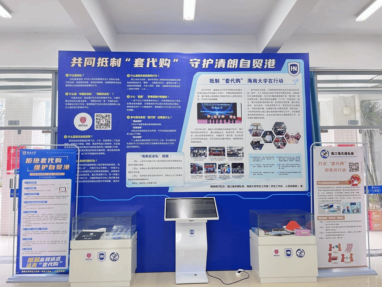 本学期,学生工作部(学生工作处、人民武装部)联合海南省打私办、海口海关缉私局等单位,在“平安社区”增设了防范“套代购”反走私展示区,集中展示了防范“代购”反走私相关的政策知识以及学校近年来开展学生防范“代购”反走私宣传教育的主要成果。