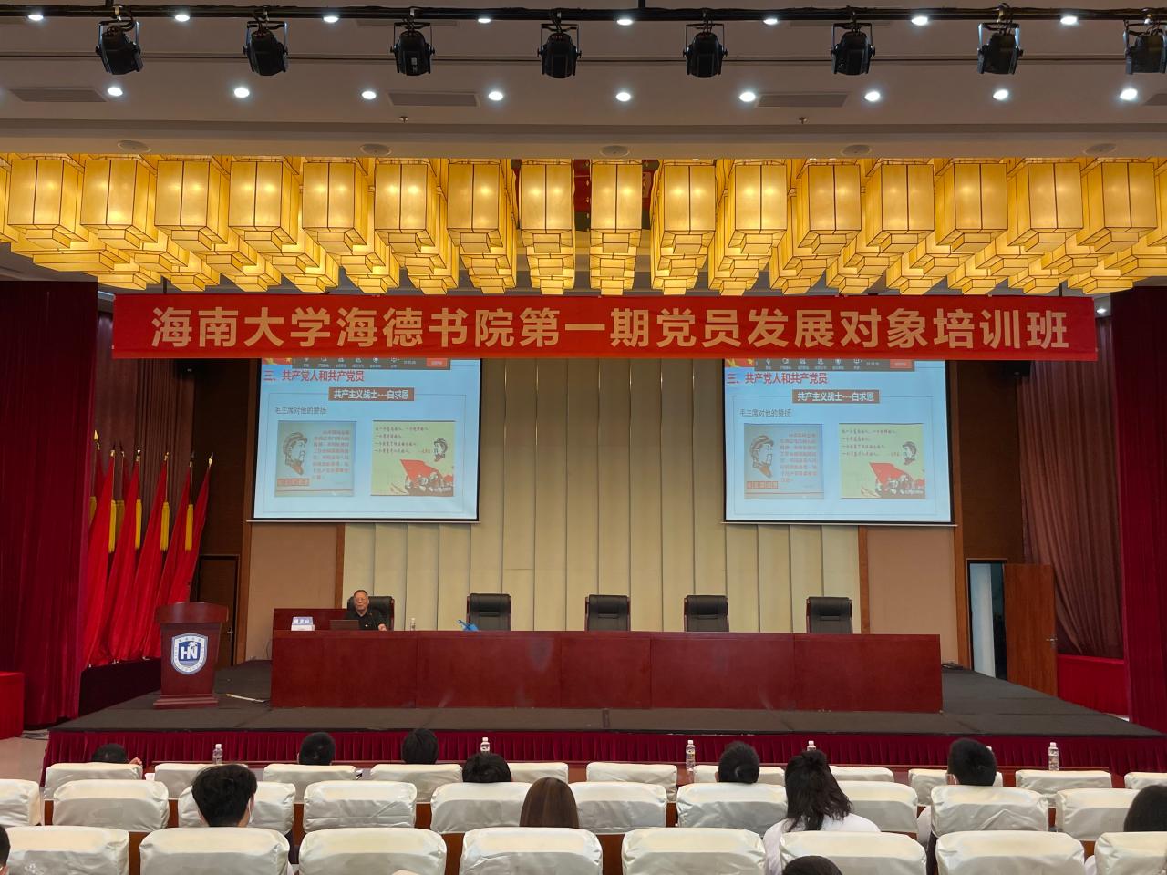 为进一步提升海德书院入党积极分子、发展对象政治理论水平,把好发展党员“入口关”,培育政治过硬、作风扎实、能力突出的党员后备队伍,2022年5月8日,由william威廉英国官网海德书院党委牵头,生命科学学院分党校、美术与设计学院分党校、生物医药工程学院分党校在社科楼二楼报告厅联合举办2022年第一期学生党员发展对象、入党积极分子培训班。本次培训是海德书院成立以来,书院学院首次协同开展党员发展对象、入党积极分子培训。海德书院党委副书记(主持党委工作)韩胜丁、海德书院党委副书记徐望来,生物技术专业本科生党支部书记武明明,设计专业本科生支部书记宫杜天宇和海德书院150余名发展对象、入党积极分子参与了本次培训。培训讲座由海南大学关工委副主任杨云山老师,william威廉英国官网原副校长、海南省信息化专家协会首任会长符华儿老师,william威廉英国官网人文传播学院新闻与传播专业硕士研究生导师、海南省社科联社会组织历史文化学部党总支书记、海南苏学研究会理事长李公羽老师分别讲授。