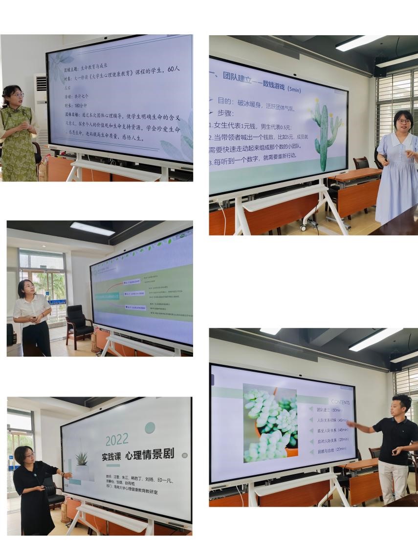 实践课集中备课环节,四个小组就《人际关系适应及提升》、《压力管理与挫折应对》、《生命教育与成长》和《心理情景剧》四个主题进行了备课情况的汇报;符少莉老师就“大学生心理健康教育课程专项培训”的“生命教育”内容进行了学习分享。教研室成员结合上学期课堂情况、本学期开课专业的特点及因疫情导致学生延迟报到等情况进行了探讨。教师们群策群力、踊跃发言,为教学设计的完善献计献策。
