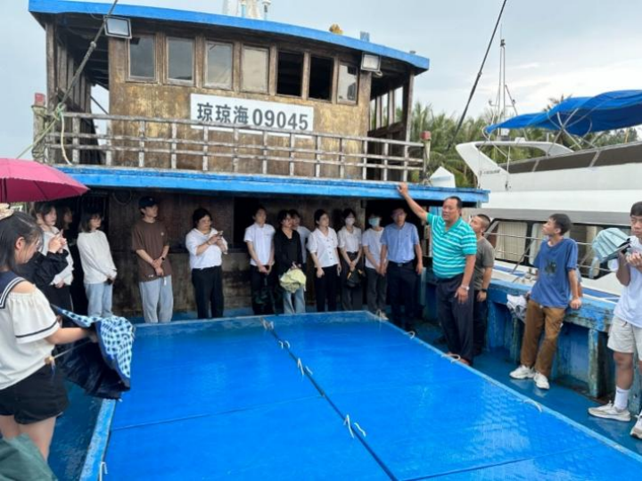 随后,王书茂书记带领同学们登上了潭门码头的琼海09045号渔船,回顾习近平总书记20134月8日在这艘渔船上对潭门港渔民的关怀和“造大船、闯深海、捕大鱼”的殷切嘱托。