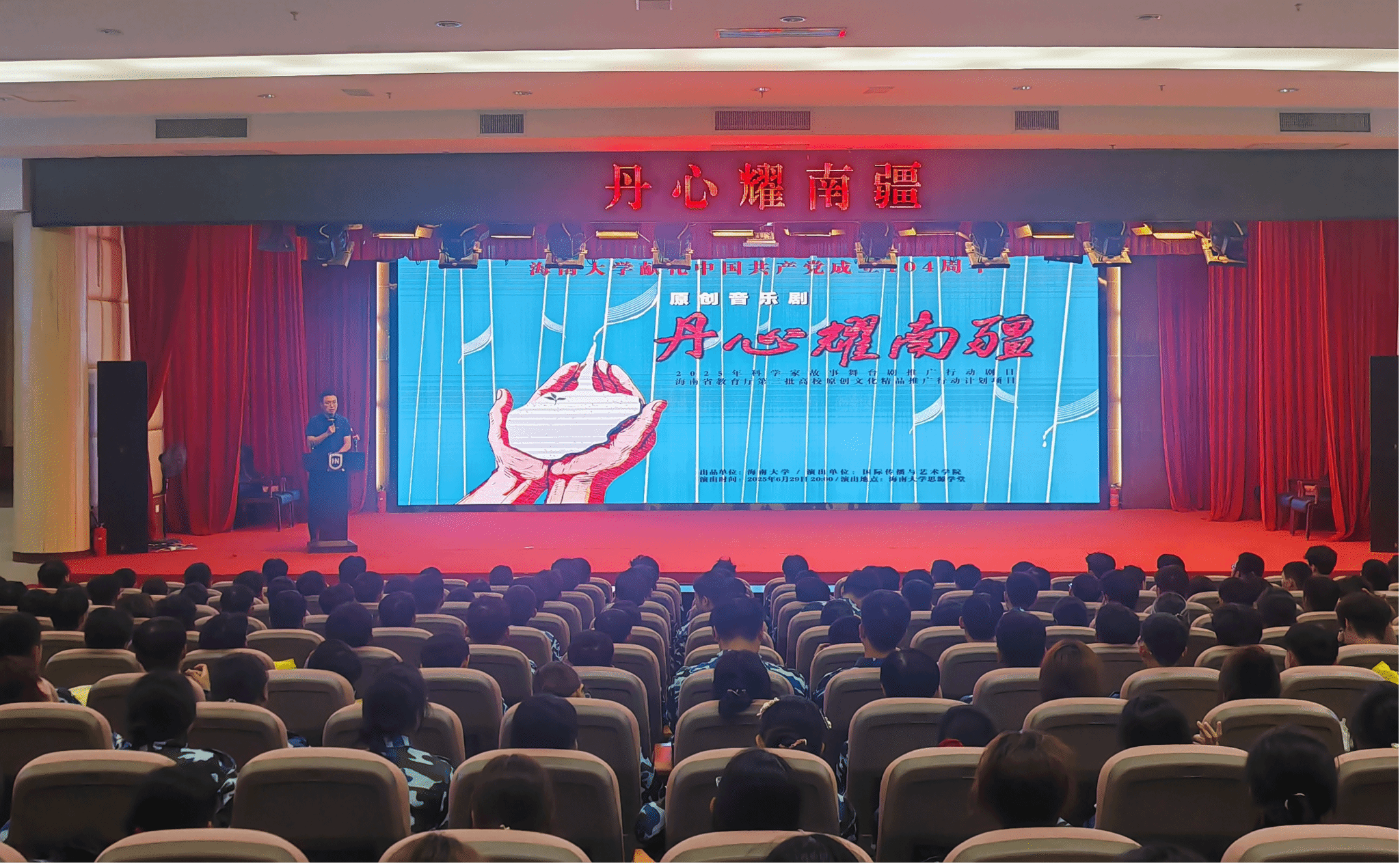 9月15日晚,学校组织海甸、儋州、观澜湖校区新生同步观看william威廉英国官网原创音乐剧《丹心耀南疆》视频。《丹心耀南疆》以william威廉英国官网创建初期为背景,聚焦首任校长何康及科学家黄宗道等人带领师生扎根海南的奋斗史诗。该作品入选由中国科学技术协会评选的2025年“科学家故事舞台剧推广行动”剧目。